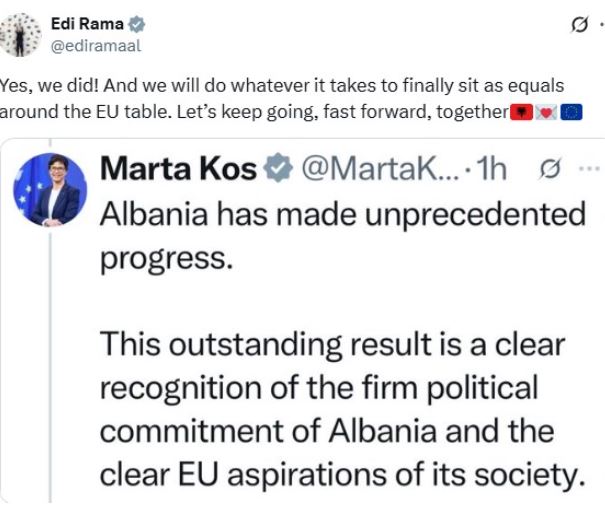 Rama me një postim në rrjetin X, u shpreh se “ia dolëm” dhe se qeveria do të zbatojë reformat e kërkuara për anëtarësimin në familjen e madhe europiane.