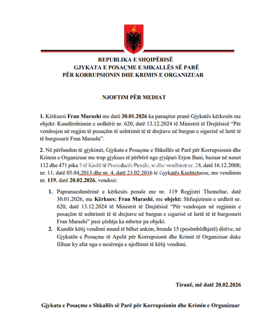 Në dokumentin e siguruar nga burimet thuhet se më 30 janar 2026, Marashi iu drejtua gjykatës me një kërkesë për kundërshtimin e urdhrit nr. 620, datë 13.12.2024, të Ministrit të Drejtësisë, “Për vendosjen në regjim të posaçëm të ushtrimit të të drejtave në burgun e sigurisë së lartë”.