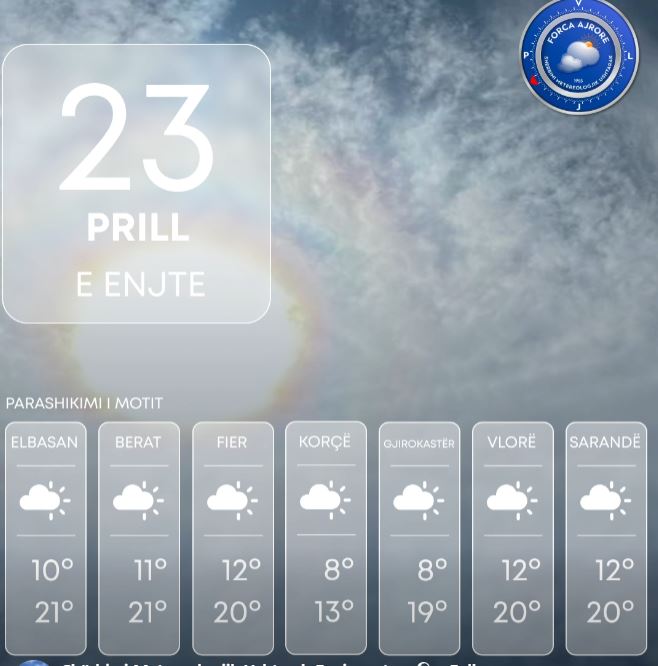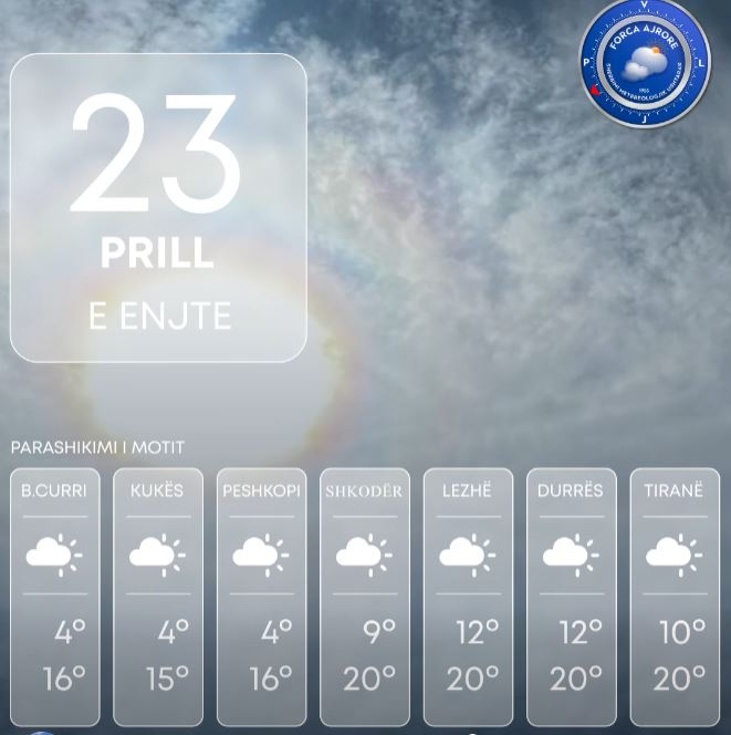 Këtë të enjte vendi ynë, do të ndikohet nga kushte atmosferike relativisht të qëndrueshme. Moti parashikohet fillimisht me alternime vranësirash si dhe kthjellime, kryesisht pas orëve të mesditës, në pjesën më të madhe të vendit.