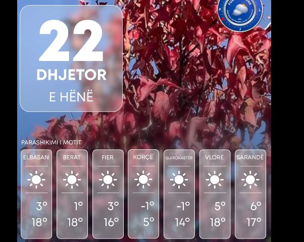 Këtë të hënë vendi ynë, do të ndikohet nga kushte atmosferike të qëndrueshme. Moti parashikohet i kthjellët e vranësira kalimtare.