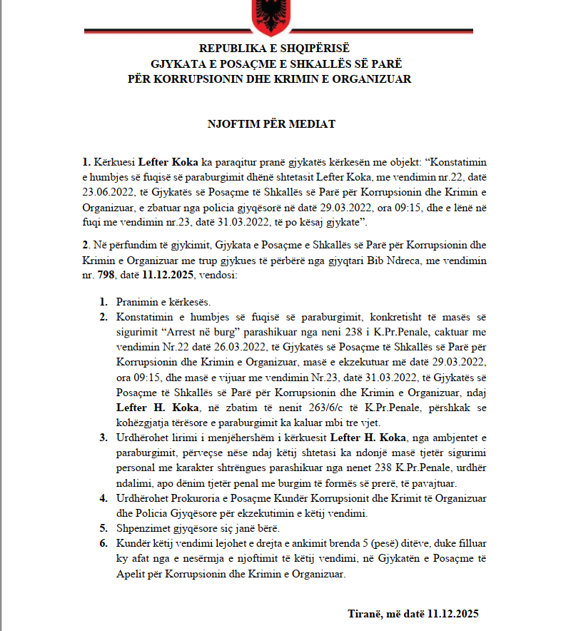 “Urdhërohet lirimi i menjëhershëm i kërkuesit Lefter H. Koka, nga ambjentet e paraburgimit, përveçse nëse ndaj këtij shtetasi ka ndonjë masë tjetër sigurimi personal me karakter shtrëngues parashikuar nga nenet 238 K.Pr.Penale, urdhër ndalimi, apo dënim tjetër penal me burgim të formës së prerë, të pavuajtuar”, thuhet në vendim.