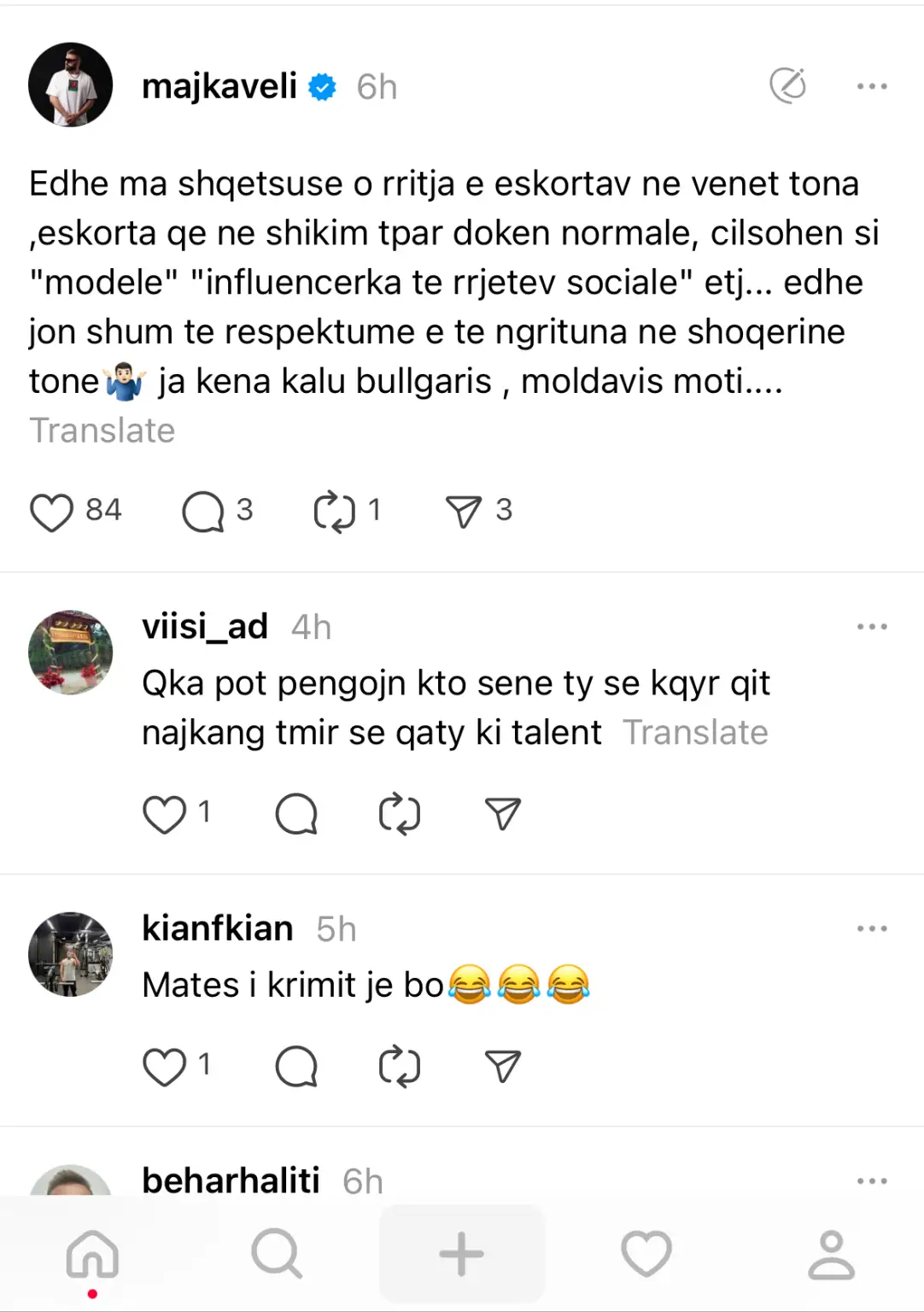 “Edhe ma shqetsuse o rritja e eskortav ne venet tona , eskorta qe ne shikim tpar doken normale, cilsohen si “modele” “influencerka te rrjetev sociale” etj… edhe jon shum te respektume e te ngrituna ne shoqerine tone ir ja kena kalu bullgaris, moldavis moti….”