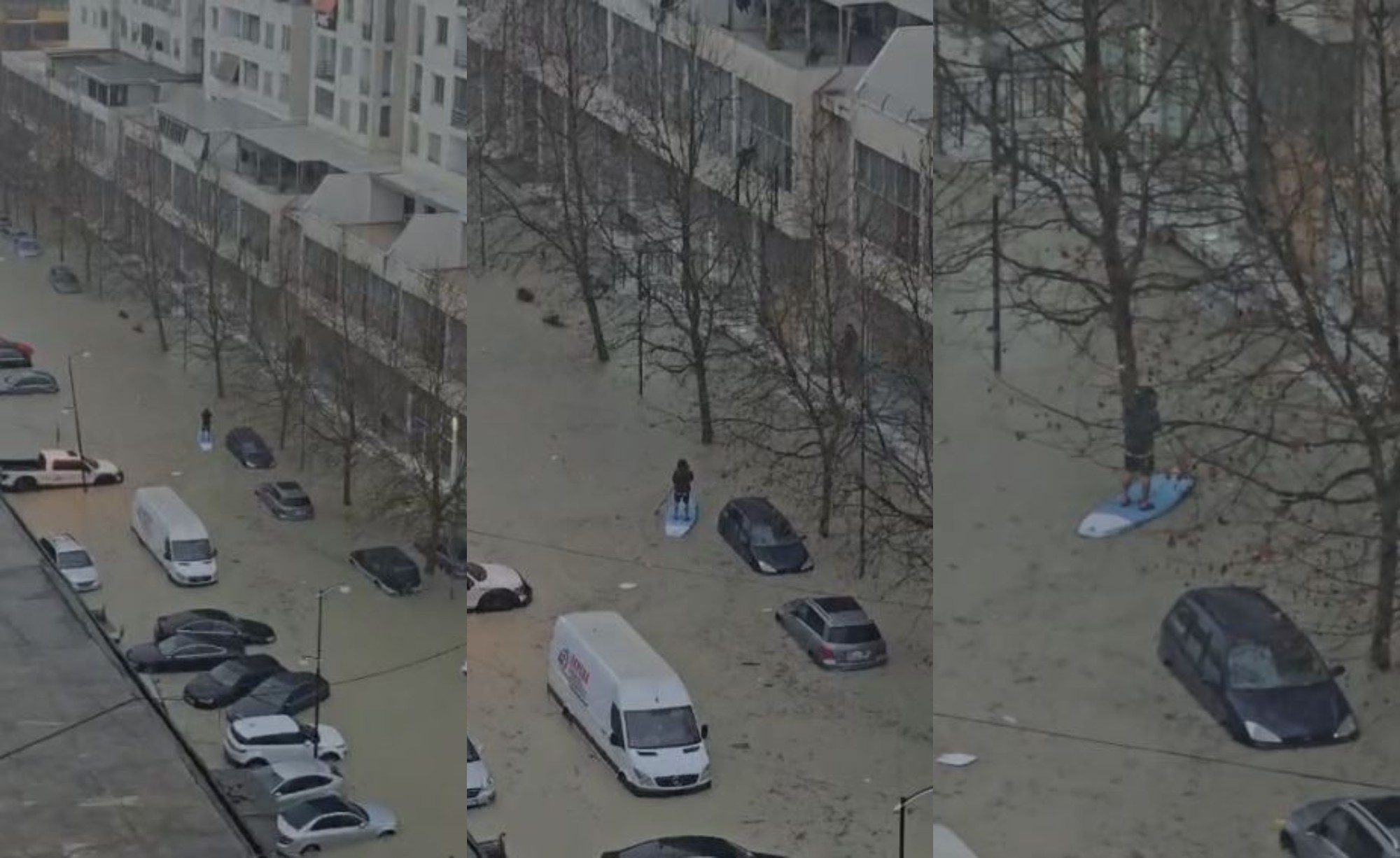 Dhjetëra makina janë përmbytur në rrugë, ndërsa lëvizja në këmbë është e pamundur. Një qytetar a përdorur një dërrasë sërfi.