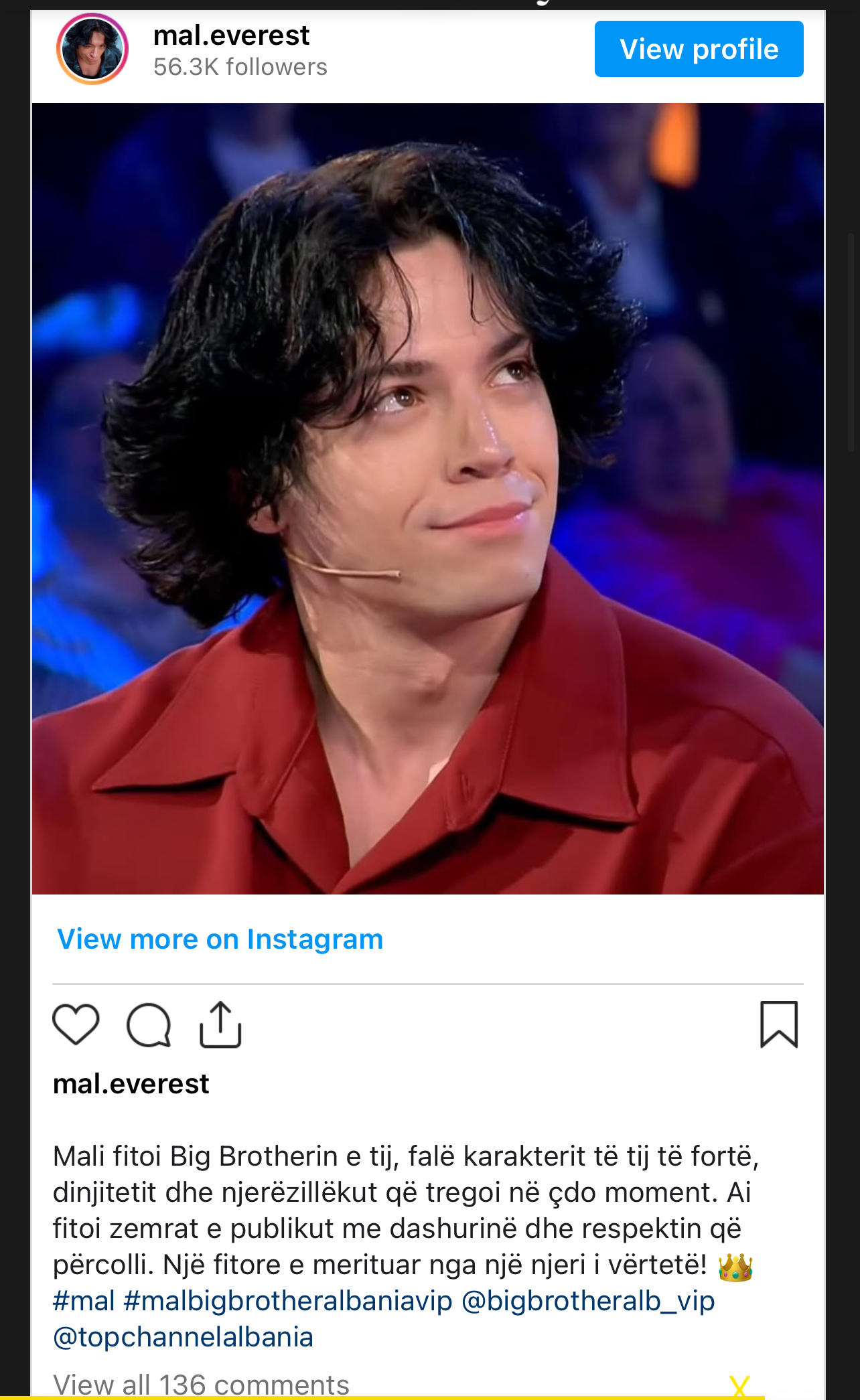 ‘Mali fitoi Big Brotherin e tij, falë karakterit të tij të fortë, dinjitetit dhe njerëzillëkut që tregoi në çdo moment. Ai fitoi zemrat e publikut me dashurinë dhe respektin që përcolli. Një fitore e merituar nga një njeri i vërtetë!’-shkruhet ne faqen e tij te IG.