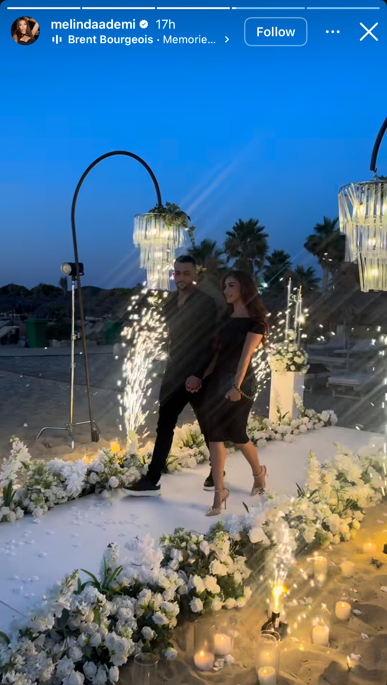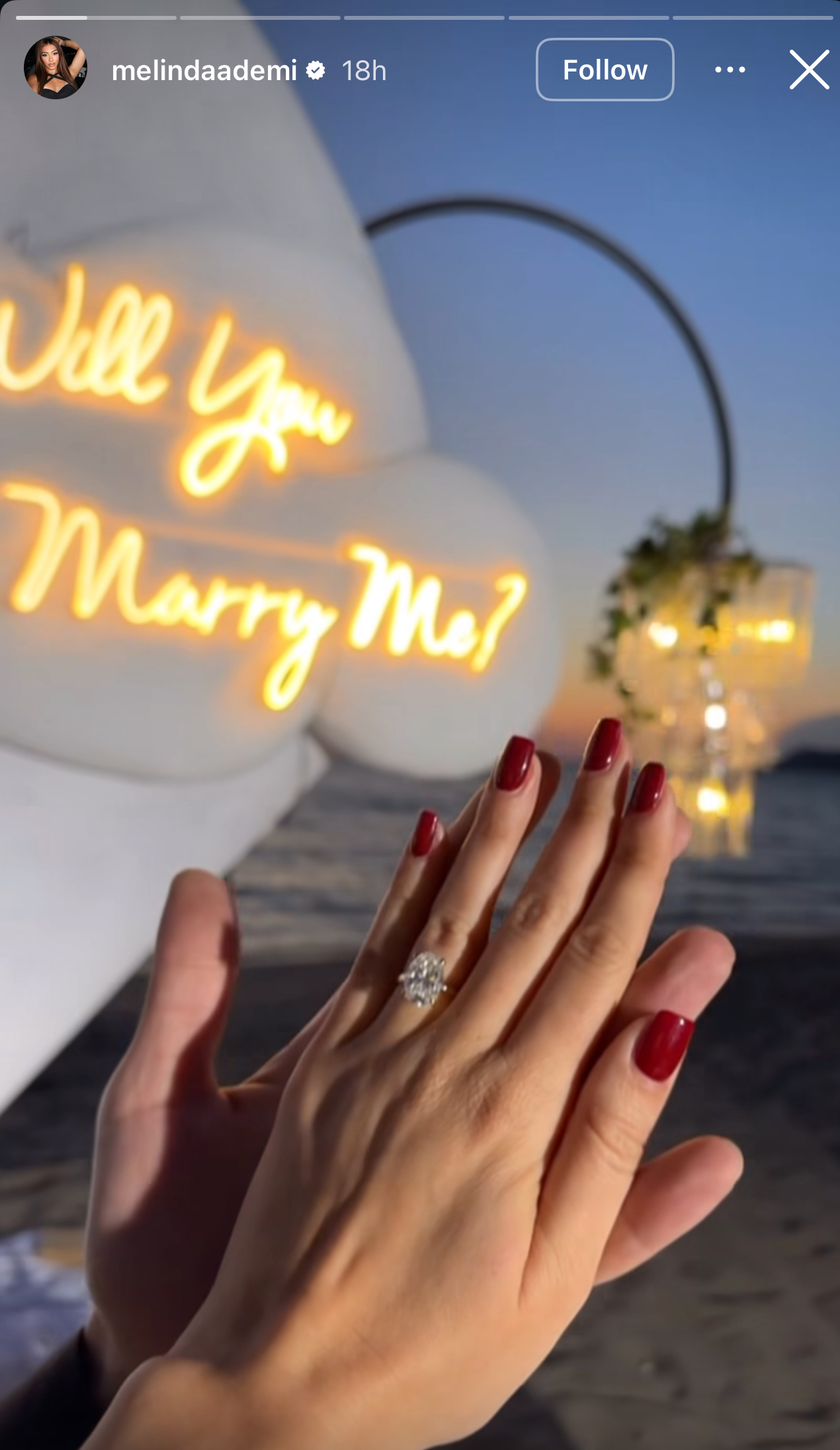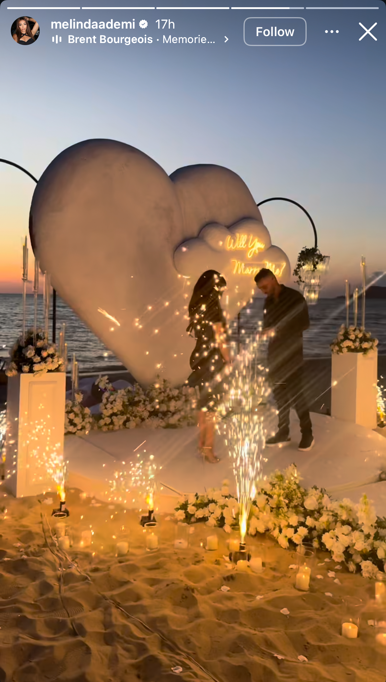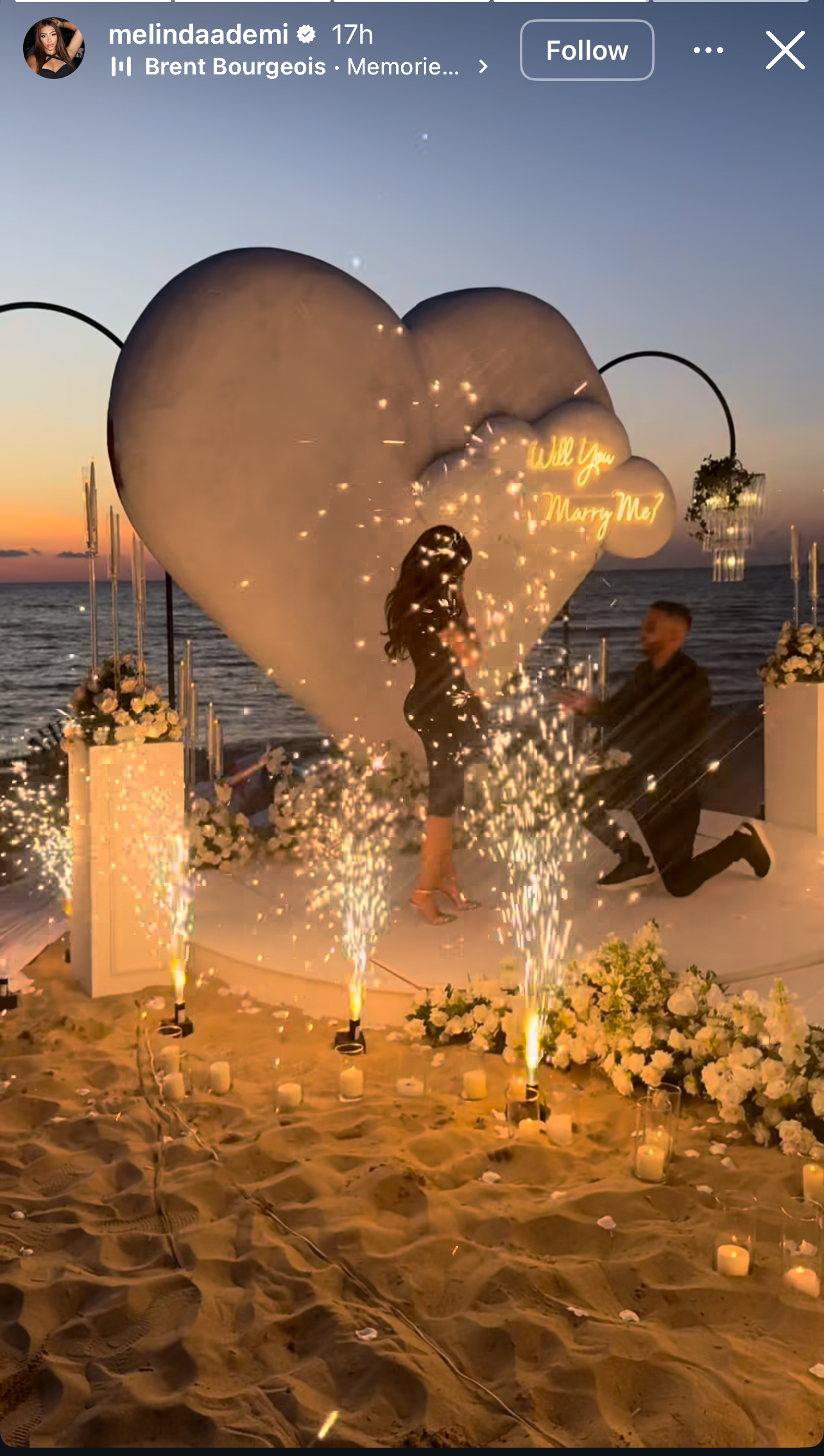 Me të ndarë lajmin e bukur me ndjekësit, artistja ka publikuar edhe momentin kulminant të propozimit, që u zhvillua në një ambient magjik buzë detit, gjatë perëndimit të diellit.