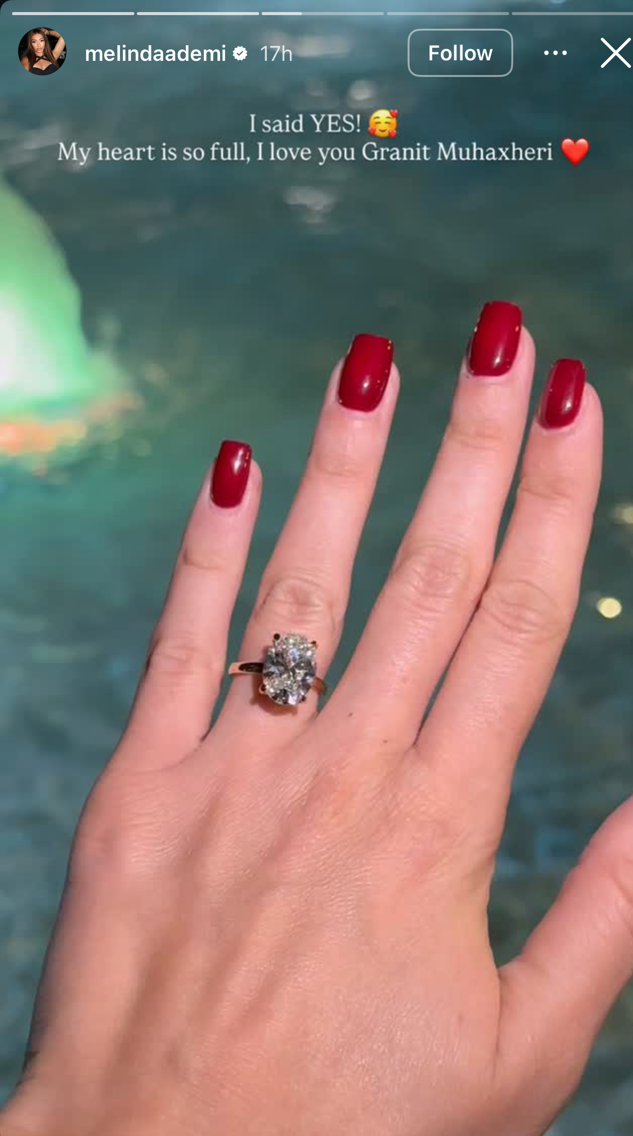 Këngëtarja e njohur shqiptare, Melinda Ademi, ka marrë një propozim për martesë nga partneri i saj, Granit Muhaxheri.