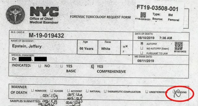 Në një version të deklasifikuar të raportit të autopsisë, i publikuar në dhjetor në kuadër të publikimit të parë të ashtuquajturave “dosjet Epstein” nga Departamenti i Drejtësisë i SHBA-së, “mënyra e vdekjes” figuron si “në pritje”, ndërsa fushat “vetëvrasje” dhe “vrasje” rezultojnë bosh.