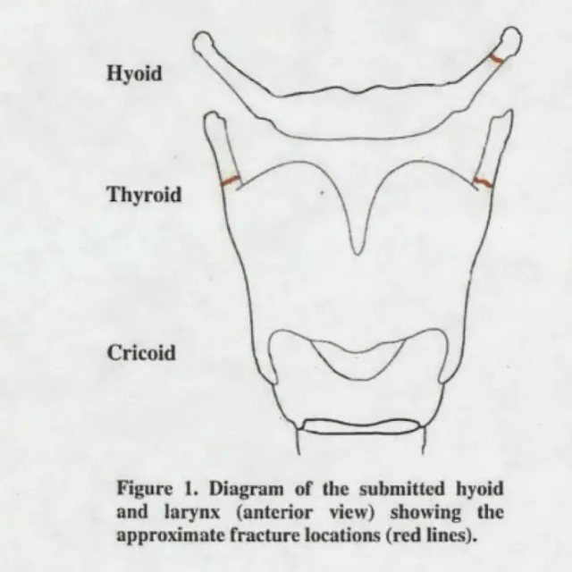 Raporti zyrtar përmend tre fraktura në qafë, një në kockën hioide të majtë dhe dy në kërcin tiroide, djathtas dhe majtas.