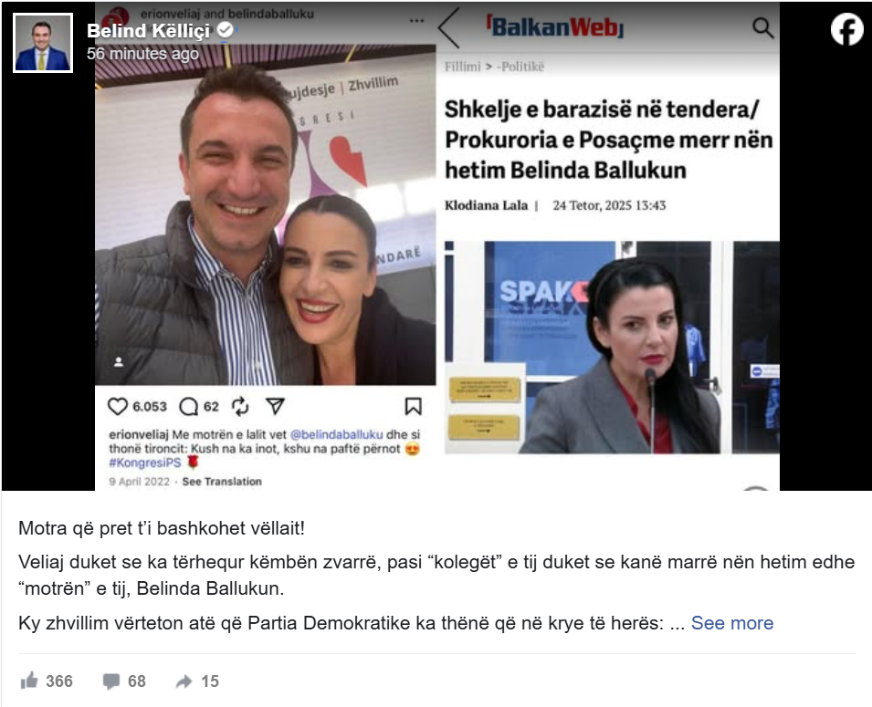 Në një postim në rrjetet sociale, deputeti i PD, Belind Këlliçi, ka reaguar pasi SPAK mori nën hetim zv/kryeministren dhe ministren e Infrastrukturës, Belinda Balluku.