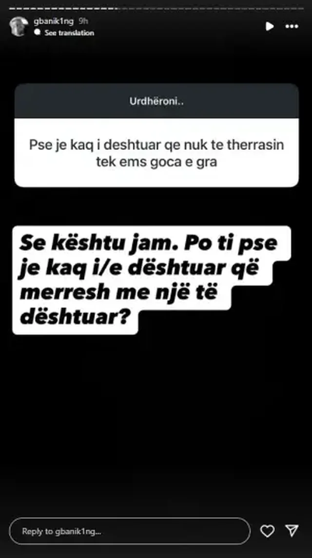 Një nga ndjekësit vendosi të provokojë me një koment me tone ofenduese, duke pyetur: “Pse je kaq i dështuar që nuk të ftojnë në emisionin Goca dhe Gra?”