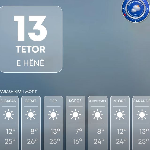 Ditën e sotme vendi ynë do të ndikohet nga kushte atmosferike të qëndrueshme. Moti parashikohet i kthjellët në të gjithë territorin, pa përjashtuar vranësira të pakta deri mesatare kalimtare.