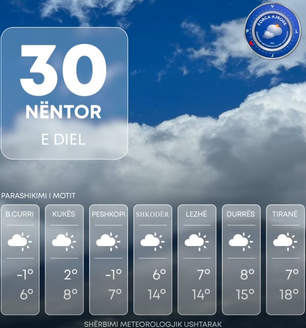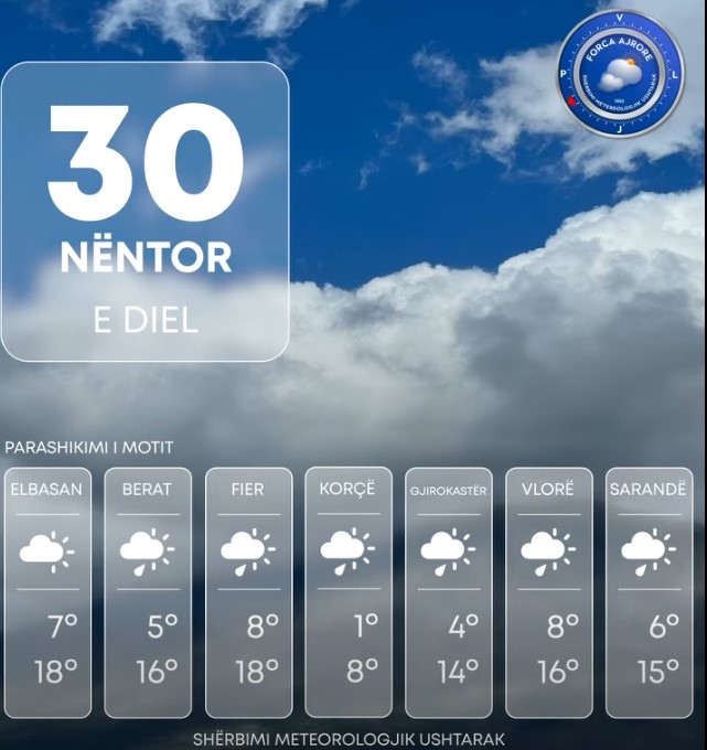 Ditën e sotme vendi ynë, do të jetë në ndikim të masave ajrore relativisht të paqëndrueshme. Moti parashikohet të jetë me vranësira dhe intervale kthjellimesh.
