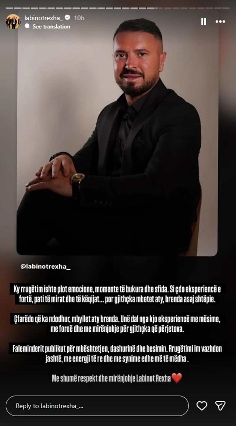Menjëherë pas daljes, Rexha zgjodhi të ndajë me ndjekësit e tij në Instagram një mesazh reflektues dhe falënderues. Krahas një fotografie, ai shkroi se ky rrugëtim ishte i mbushur me emocione, momente të bukura dhe sfida të shumta. “Si çdo eksperiencë e fortë, pati të mirat dhe të këqijat, por gjithçka mbetet aty, brenda asaj shtëpie. Çfarëdo që ka ndodhur, mbyllet aty brenda. Unë dal nga kjo eksperiencë me mësime, me forcë dhe me mirënjohje për gjithçka që përjetova”, u shpreh ai.