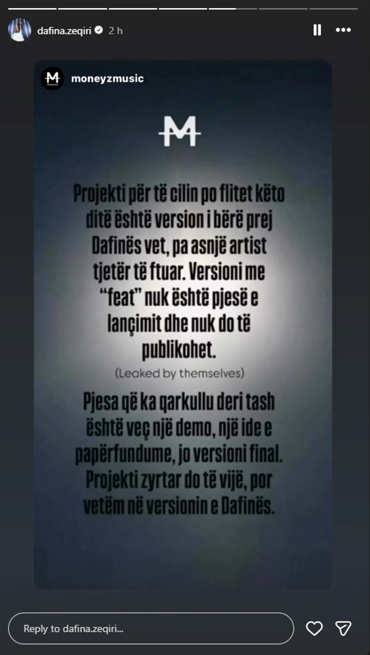 Pa përmendur reperin Fero apo projektin në fjalë, ata theksuan se projekti do të publikohet vetëm në versionin e Dafinës dhe jo si bashkëpunim.