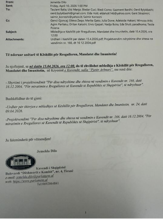 “Kryetari i Kuvendit ka njoftuar sot thirrjen e mbledhjes së Këshillit për Rregulloren, Mandatet dhe Imunitetin për në datë 15.04.2026, ora 12:00, me rend dite: “Shyrtimi i projektvendimit “Për disa ndryshime dhe shtesa në vendimin e Kuvendit nr. 166, datë 16.12.2004, “Për miratimin e Rregullores së Kuvendit të Republikës së Shqipërisë”, të ndryshuar”.
