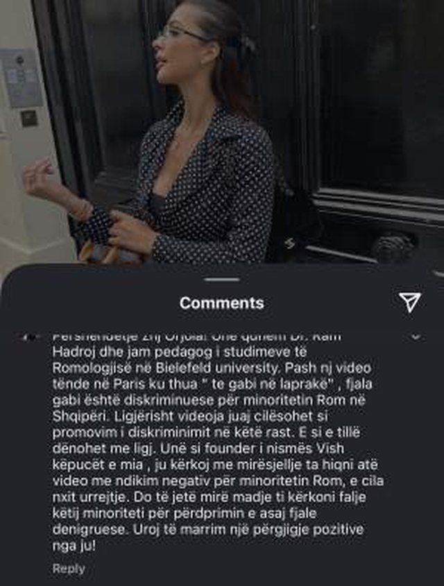 Përshëndetje znj. Oriola! Unë quhem Dr. Kaim Hadroj dhe jam pedagog i studimeve të Romologjisë në Bielefeld University. Pashë një video tënde në Paris ku the “te gabi në Laprakë”, fjala gabi është diskriminuese për minoritetin Rom në Shqipëri. Ligjërisht videoja juaj cilësohet si promovim i diskriminimit në këtë rast. E nëse dihet, denohet me ligj. Unë si founder i nismës Vish këpucët e mia, ju kërkoj me mirësi që ta hiqni atë video me ndikim negativ për minoritetin Rom, e cila s’vihet në dyshim. Do të ishte mirë madje t’i kërkonit falje këtij minoriteti për përdorimin e asaj fjale diskriminuese. Uroj të marrim një përgjigje pozitive nga ju!