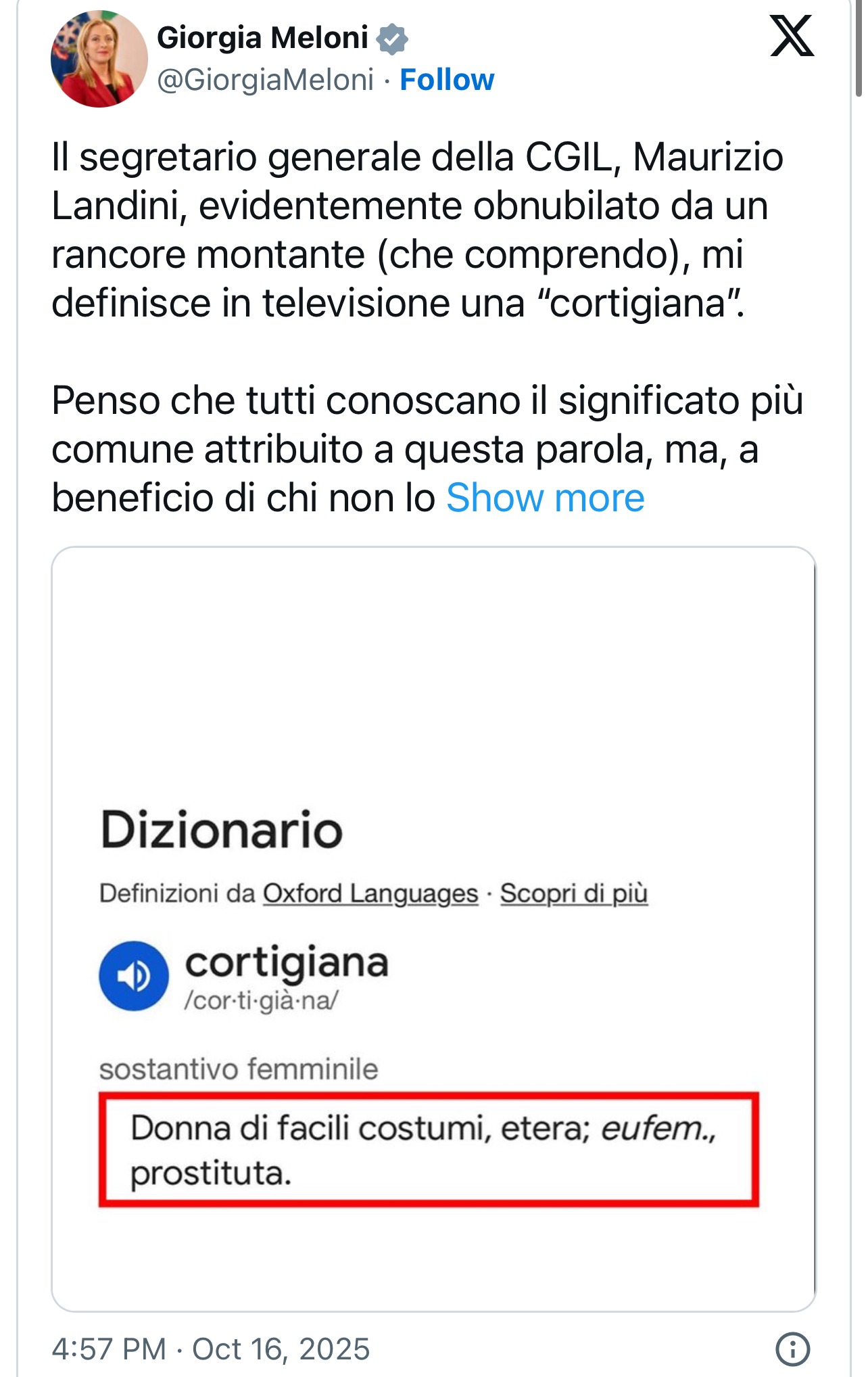 “Nëse dikush nuk e di kuptimin më të zakonshëm të fjalës ‘kortigjane’, po e ndaj unë: do të thotë prostitutë. Landini, i verbuar nga një mllef që mund ta kuptoj, më quan kështu në publik. Kjo është e majta që na bëri moral për dekada për respektin ndaj grave – dhe që sot më fyen për mungesë argumentesh”, shkruan Meloni në postimin e saj.
