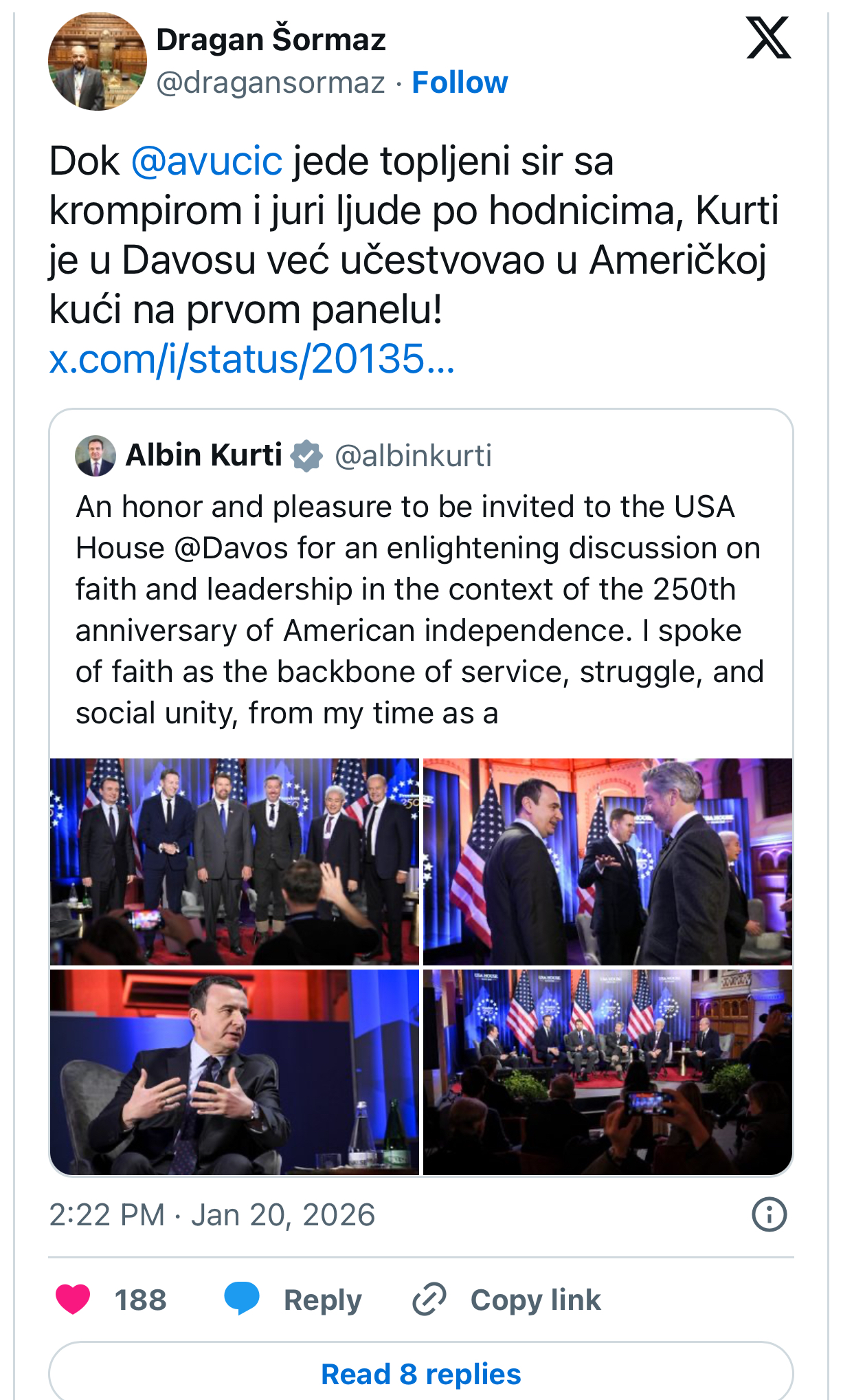 “Gjersa Aleksandar Vuçiq po hanë djathë me patate të nxehta dhe po i ndjek njerëzit në korridore, Kurti në Davos tashmë ka marr pjesë në Shtëpinë Amerikane në panelin e parë!”, deklaroi kryetar i Këshillit Euroatlantik të Serbisë, Shormaz.