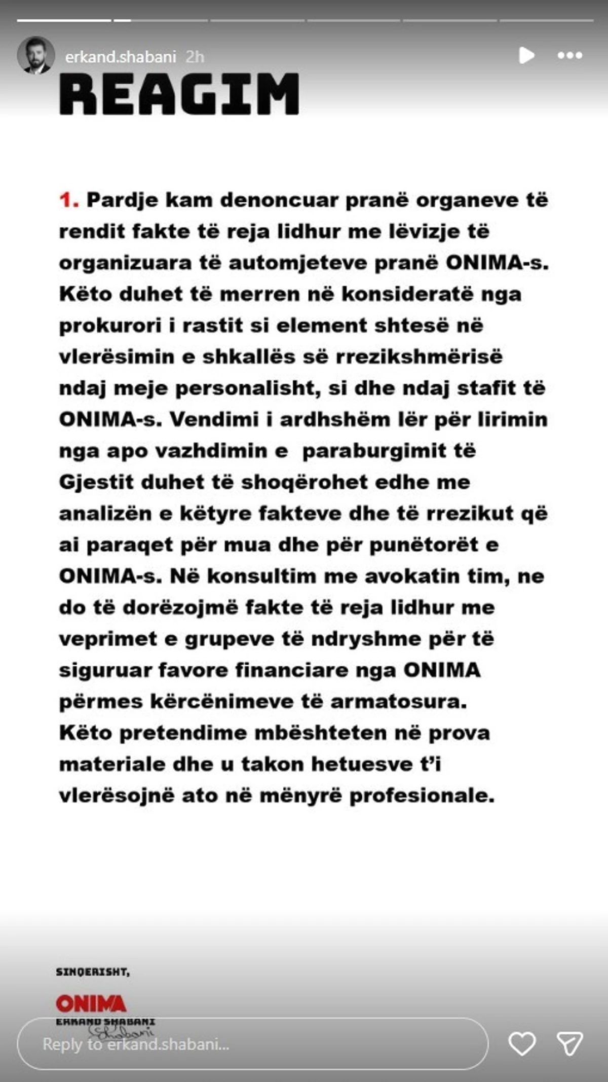 Shabani përfundon reagimin duke bërë thirrje që të ndalet gjuha që nxit dhunë dhe duke theksuar se kompania ONIMA do të vazhdojë të mbrojë qëndrimin e saj përmes mjeteve ligjore.