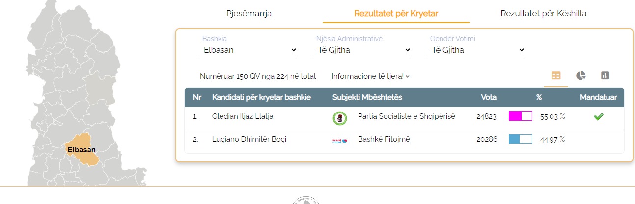 Kandidati i PS-së, Llatja kryeson me 55.03 % të votave ose 24823 vota, ndërsa kandidati i koalicionit “Bashkë Fitojmë”, Luçiano Boçi ka arritur të marrë 44.97 % ose 20286./Albeu.com.