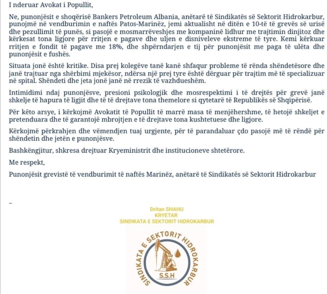 Në ditën e dhjetë të grevës, punonjësit e kompanisë “Bankers Petroleum” kanë ndërmarrë një hap të ri duke iu drejtuar zyrtarisht Komisionerit për Mbrojtjen nga Diskriminimi, Avokatit të Popullit dhe Ambasadorit të Bashkimit Europian në Shqipëri, Silvio Gonzato.