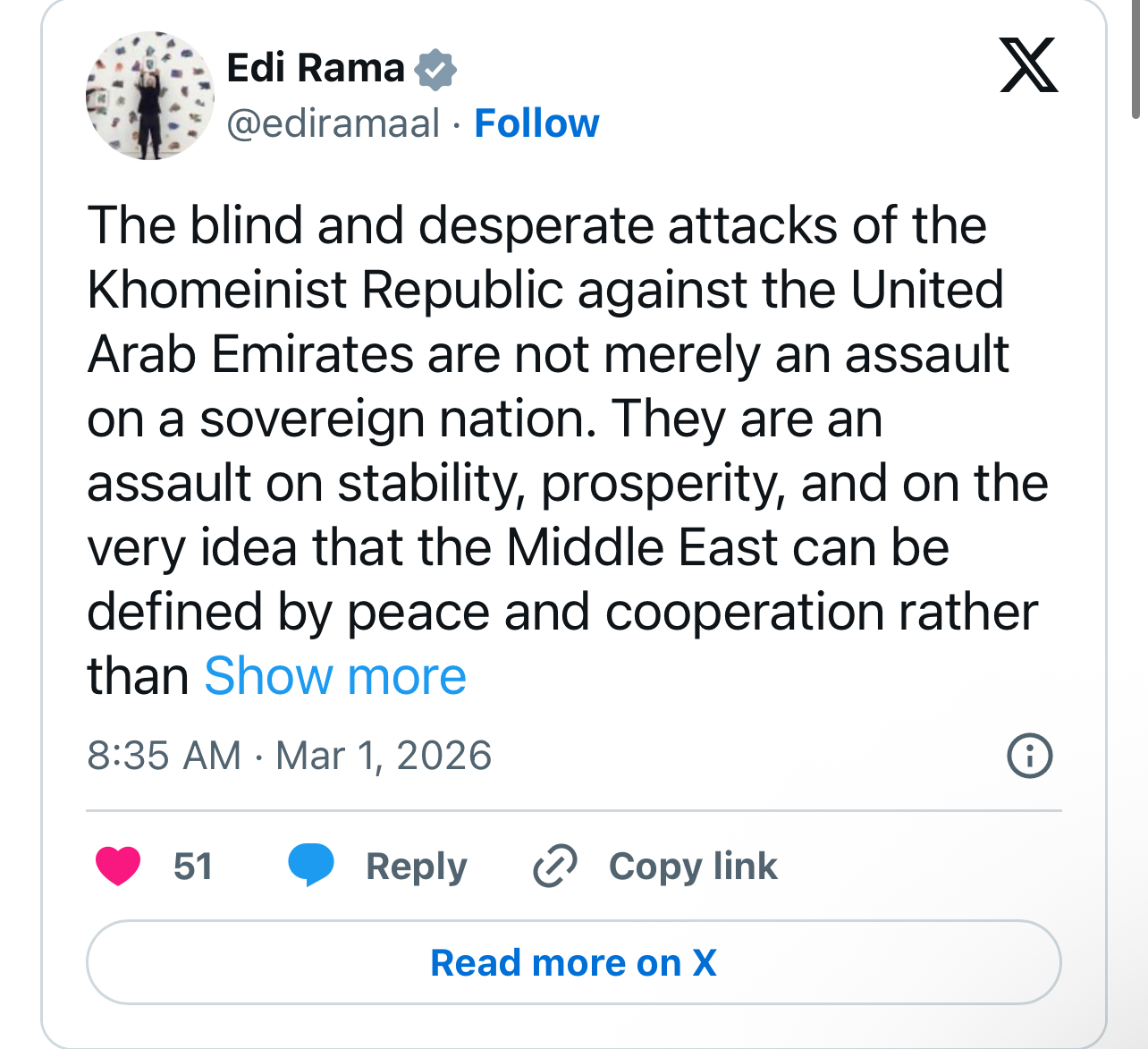Kryeministri i Shqipërisë, Edi Rama, ka reaguar pas sulmeve me raketa të drejtuara nga Irani ndaj vendeve të rajonit, kryesisht ndaj Emiratet e Bashkuara Arabe, përfshirë Dubain.
