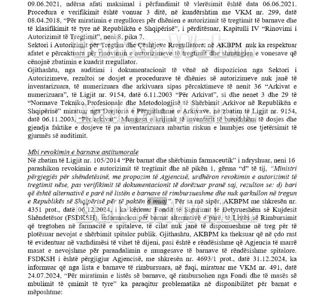 Në disa raste, thuhet ne raportin me rreth 200 faqe, pacientët kanë qëndruar me muaj pa marrë asnjë dozë kimioterapie, ndërsa qindra të tjerë kanë marrë trajtimin me ndërprerje, jashtë çdo protokolli mjekësor. “Mungesat kanë qenë të përsëritura, dhe në disa kontrata furnizimi, periudha pa ilaçe ka zgjatur deri në 6 muaj”, shkruhet ne dokumentin e KLSH. Gjatë verifikimeve në Farmacinë Qendrore ne QSUT, janë gjetur gjithashtu periudha të gjata ku stoku i barnave ka qenë zero, si në magazinën qendrore të spitalit, ashtu edhe në farmacinë që furnizon direkt pavionet e onkologjisë.