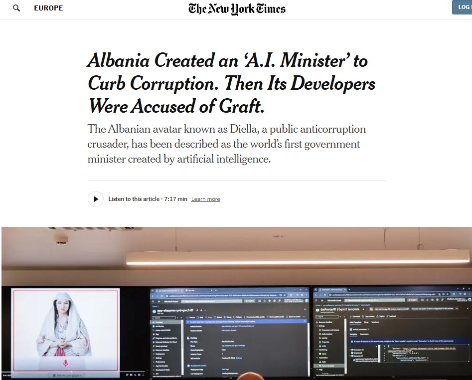 Gazeta amerikane, New York Times, i ka kushtuar një shkrim Ministres së Shtetit për Inteligjencën Artificiale “Diella”, e prezantuar nga qeveria shqiptare si ministrja e parë në botë e krijuar nga inteligjenca artificiale, e cila synon të ndihmojë në luftën kundër korrupsionit, ndërsa vendi përparon drejt anëtarësimit në Bashkimin Evropian.