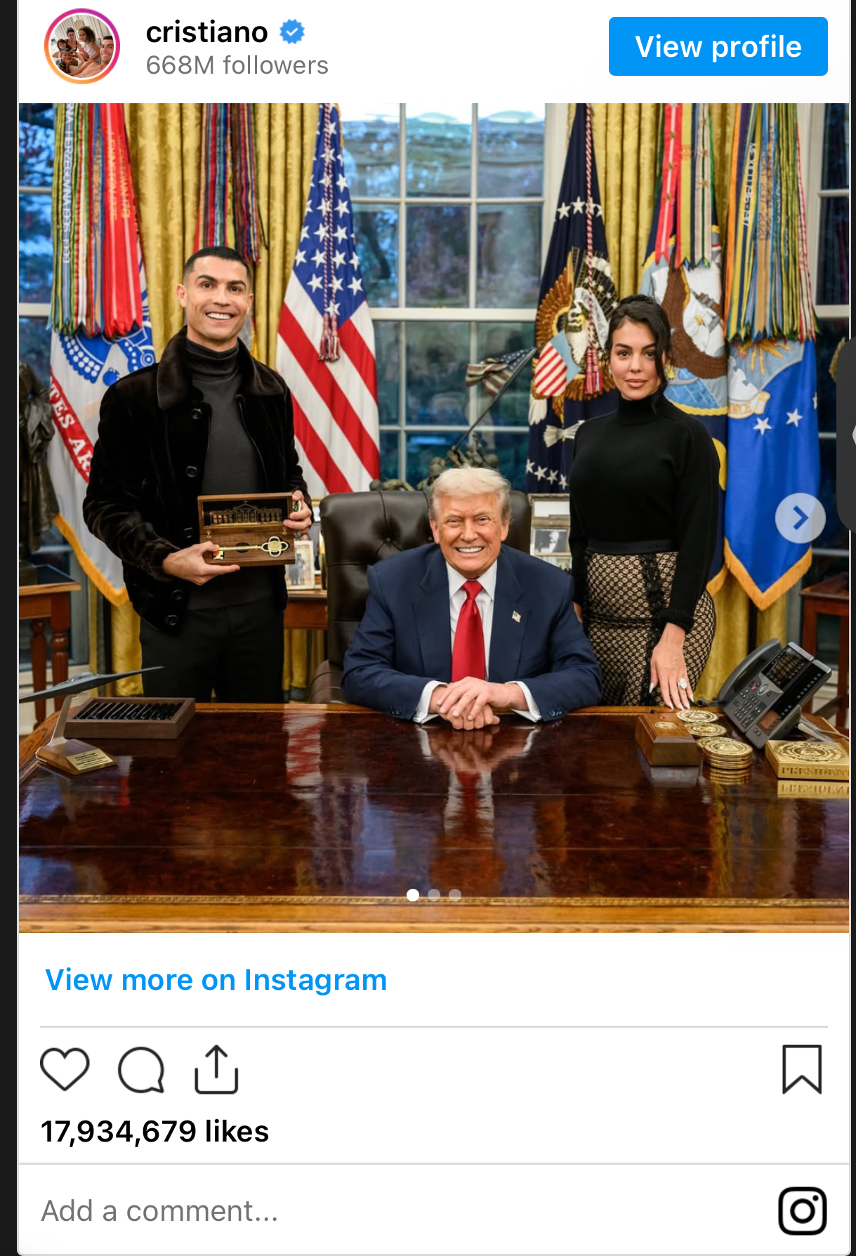 Ylli portugez i futbollit, Cristiano Ronaldo, ka ndarë në rrjetet sociale foto nga takimi i tij me Presidentin amerikan, Donald Trump, dhe Zonjën e Parë, Melania Trump, duke falënderuar për mikpritjen e ngrohtë që i është bërë atij dhe të fejuarës së tij, Georgina Rodriguez.