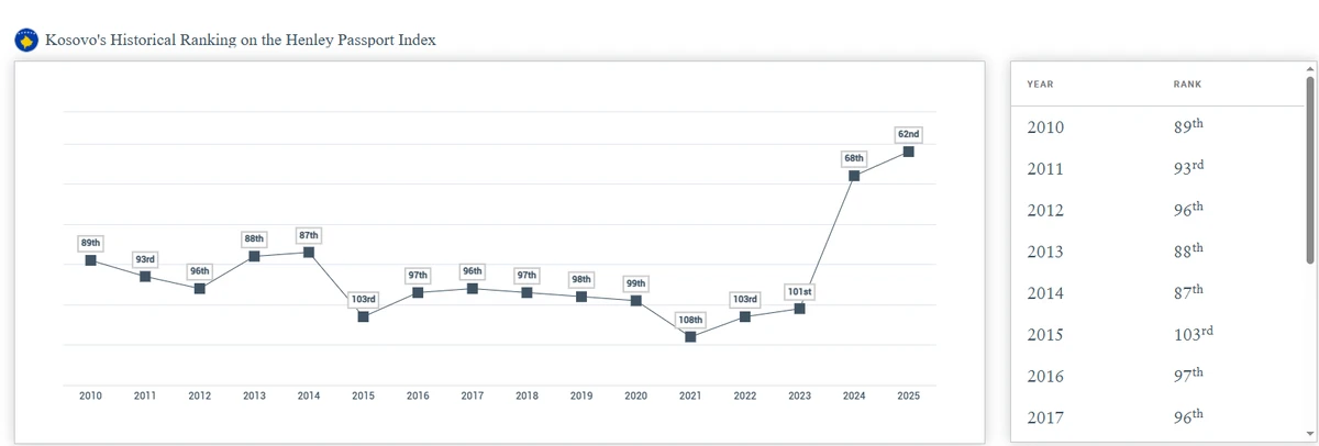 Kosova ka shënuar përparim në Indeksin e Pasaportave Henley, një renditje ndërkombëtare që mat fuqinë e pasaportave, duke u renditur tani në vendin e 62-të globalisht.