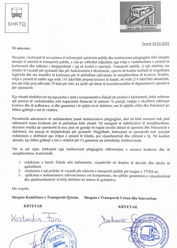 Shoqatat, vlerësojnë të nevojshme të informojnë opinionin publik dhe institucionet përgjegjëse mbi situatën aktuale të sektorit të transportit publik, e cila po ndikohet ndjeshëm nga rritja e vazhdueshme e çmimit të karburantit dhe ndikimi i drejtpërdrejtë i saj në kostot e operimit. Transporti publik, si një shërbim me rëndësi të veçantë për qytetarët dhe për funksionimin e ekonomisë, operon në kushte tarifash të rregulluara ligjërisht dhe me mundësi të kufizuara për të përballuar ndryshime të menjëhershme të kostove. Kështu, rritja e çmimit të naftës nga rreth 145 lekë/litër përpara krizave të fundit, në rreth 214 lekë/litër aktualisht, pra një rritje prej afërsisht 70 lekë për litër, ka sjellë një shtim të konsiderueshëm të shpenzimeve operative për operatorët.