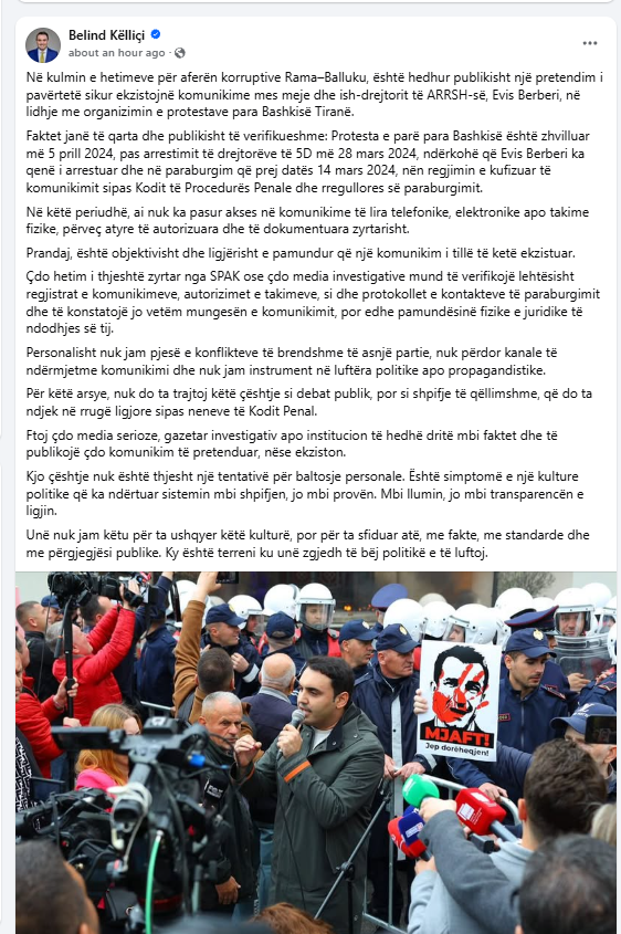 Në kulmin e hetimeve për aferën korruptive Rama–Balluku, është hedhur publikisht një pretendim i pavërtetë sikur ekzistojnë komunikime mes meje dhe ish-drejtorit të ARRSH-së, Evis Berberi, në lidhje me organizimin e protestave para Bashkisë Tiranë.