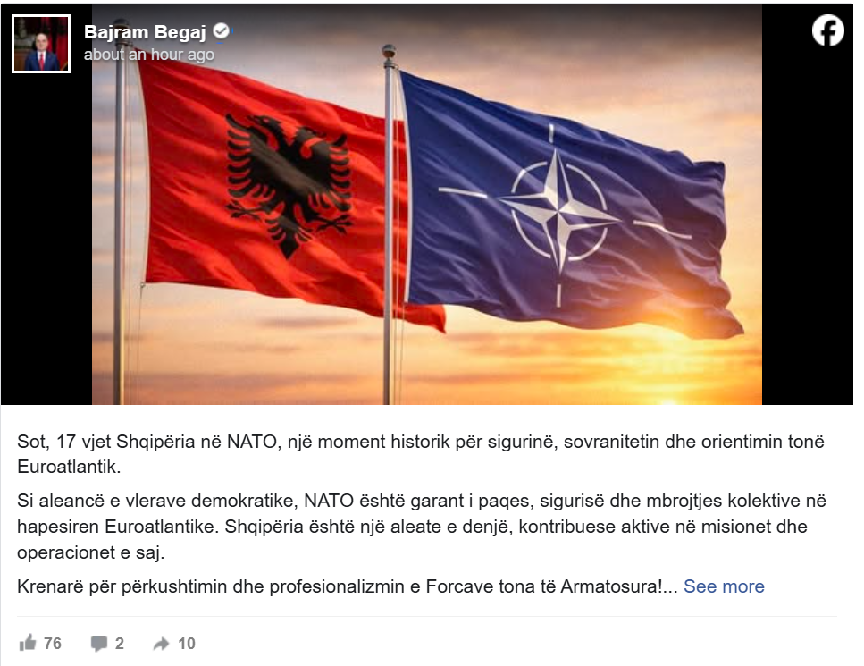 Si aleancë e vlerave demokratike, NATO është garant i paqes, sigurisë dhe mbrojtjes kolektive në hapesiren Euroatlantike. Shqipëria është një aleate e denjë, kontribuese aktive në misionet dhe operacionet e saj. Krenarë për përkushtimin dhe profesionalizmin e Forcave tona të Armatosura! Mbetemi të bashkuar për paqen, stabilitetin dhe një të ardhme më të sigurt për të gjithë”, shkruhet në postimin e Begajt.