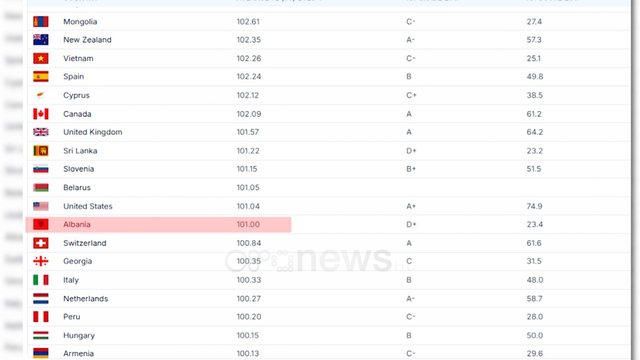 Shqipëria arriti një mesatare prej 101 pikësh, duke shënuar një rritje me 3.81 pikë nga matja e vitit të shkuar, siç tregon analiza.