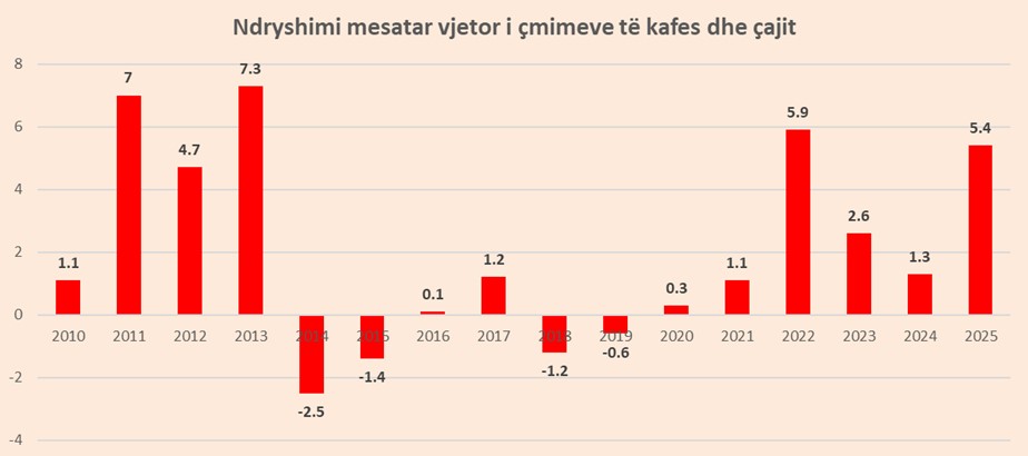 Shkaku kryesor i rritjes së fortë në vitin e fundit lidhet me ofertën globale për kafe të shkaktuar nga klima.