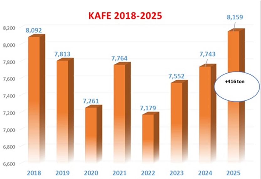 Importet e kafesë vitin e kaluar arritën në një rekord prej 8,1 mijë tonë me rritje 5,3% në krahasim me 2024, sipas doganave.