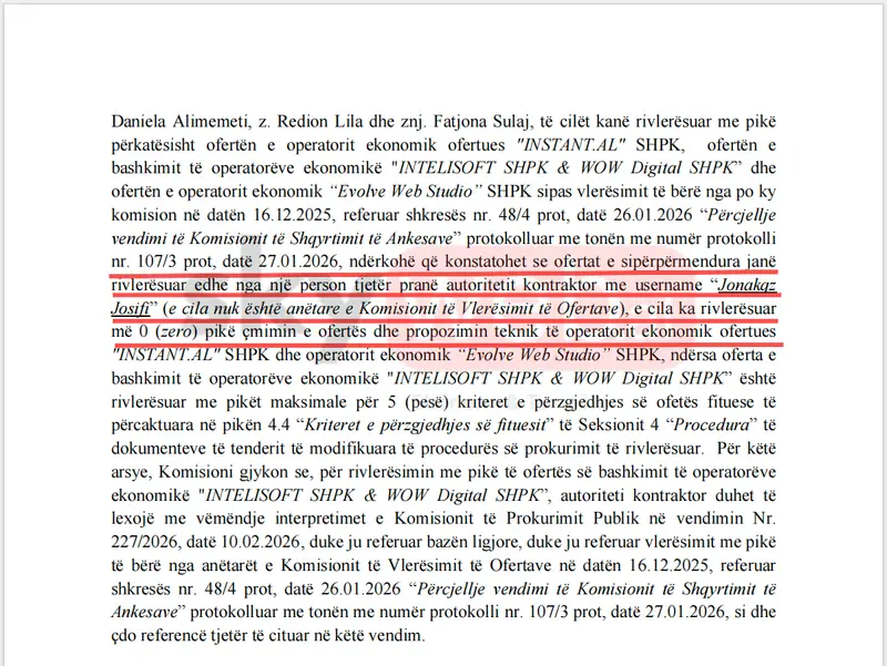 Ky përdorues, thotë KPP, ka dhënë 0 pikë për ofertat dhe propozimet teknike të “INSTANT.AL” dhe “EVOLVE WEB STUDIO”, ndërsa ka vlerësuar me pikët maksimale për të pesë kriteret ofertën e “INTELISOFT & WOW DIGITAL”.