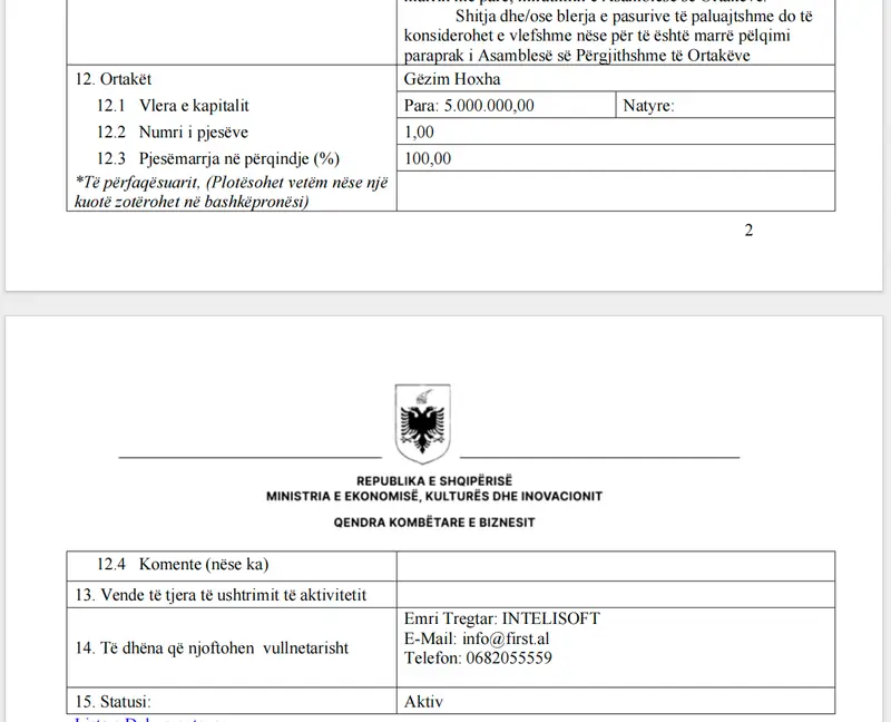Skandali merr përmasa edhe më të mëdha kur analizohet kompania që ka përfituar nga ky rivlerësim. “INTELISOFT”, në dokumente rezulton në pronësi të z.Gëzim Hoxha, një emër i njohur në dosjen e AKSHI-t dhe në hetimet e SPAK.