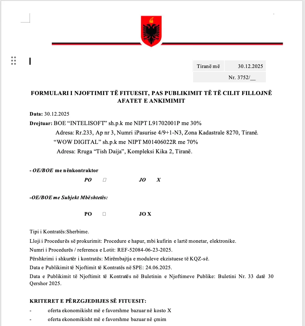 Në këtë procedurë kanë marrë pjesë disa kompani duke dhënë këto oferta: “INSTANT.AL” me ofertë 33,700,000 lekë, vlerësuar me 89.7 pikë, “EVOLVE WEB STUDIO” me ofertë 33,000,000 lekë, vlerësuar 90.9 pikë, si dhe bashkimi i operatorëve “INTELISOFT” dhe “WOW DIGITAL” me ofertë 40,823,564, vlerësuar me 112.4 pikë. Kjo e fundit është shpallur dhe oferta fituese nga KQZ edhe pse ishte më e larta.