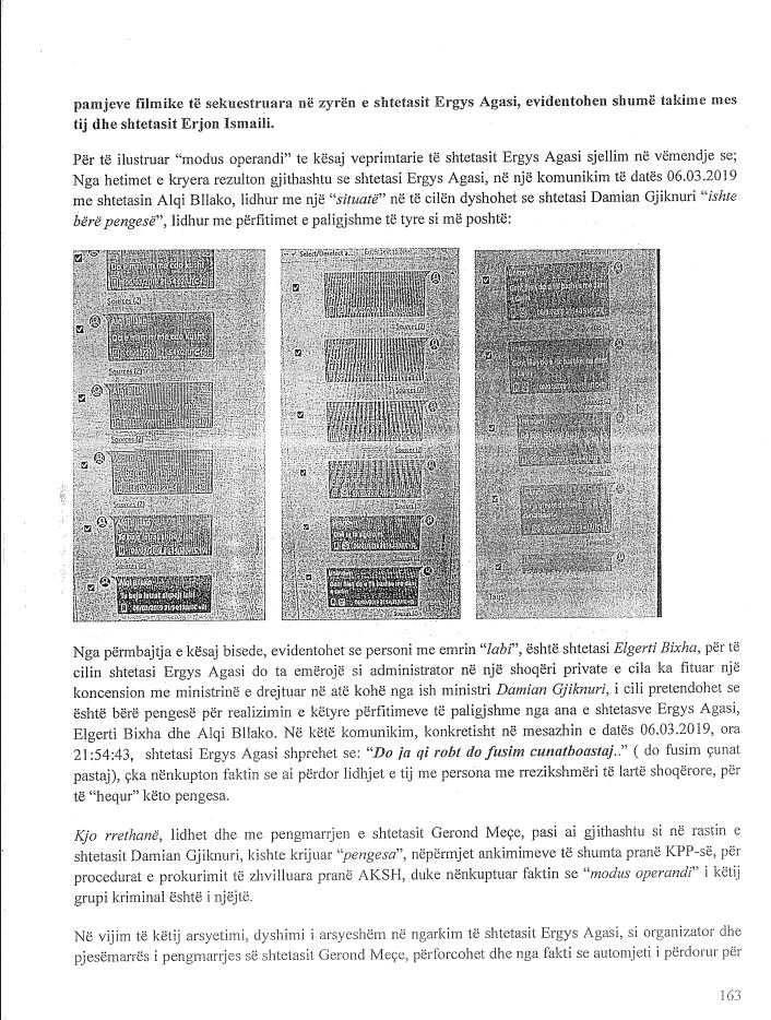 “Nga përmbajtja e kësaj bisede, evidentohet se personi me emrin “labi”, është shtetasi Elgerti Bixha, për te cilin shtetasi Ergys Agasi do ta emëroje si administrator ne një shoqëri private e cila ka fituar një koncesion me ministrinë e drejtuar ne atë kohe nga ish ministri Damian Gjiknuri, i cili pretendohet se është bere pengese për realizimin e këtyre përfitimeve te paligjshme nga ana e shtetasve Ergys Agasi, Elgerti Bixha dhe Alqi Bllako. Në ketë komunikim, konkretisht në mesazhin e datës 06.03.2019, ora 21 :54:43, shtetasi Ergys Agasi shprehet se: “Do ja q* robt do fusim çunat pastaj” ç’ka nënkupton faktin se ai përdor lidhjet e tij me persona me rrezikshmëri te larte shoqërore, për të “hequr” këto pengesa. “