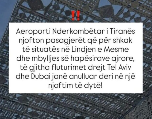 Aeroporti Ndërkombëtar i Tiranës ka njoftuar ndërprerjen e përkohshme të fluturimeve drejt Tel Avivit dhe Dubait, si pasojë e përshkallëzimit të situatës së sigurisë në Lindjen e Mesme dhe mbylljes së disa hapësirave ajrore në rajon.