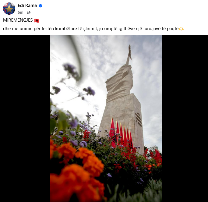 “MIRËMENGJES 🇦🇱 dhe me urimin për festën kombëtare të çlirimit, ju uroj të gjithëve një fundjavë të paqtë🫶”, shkroi Rama.