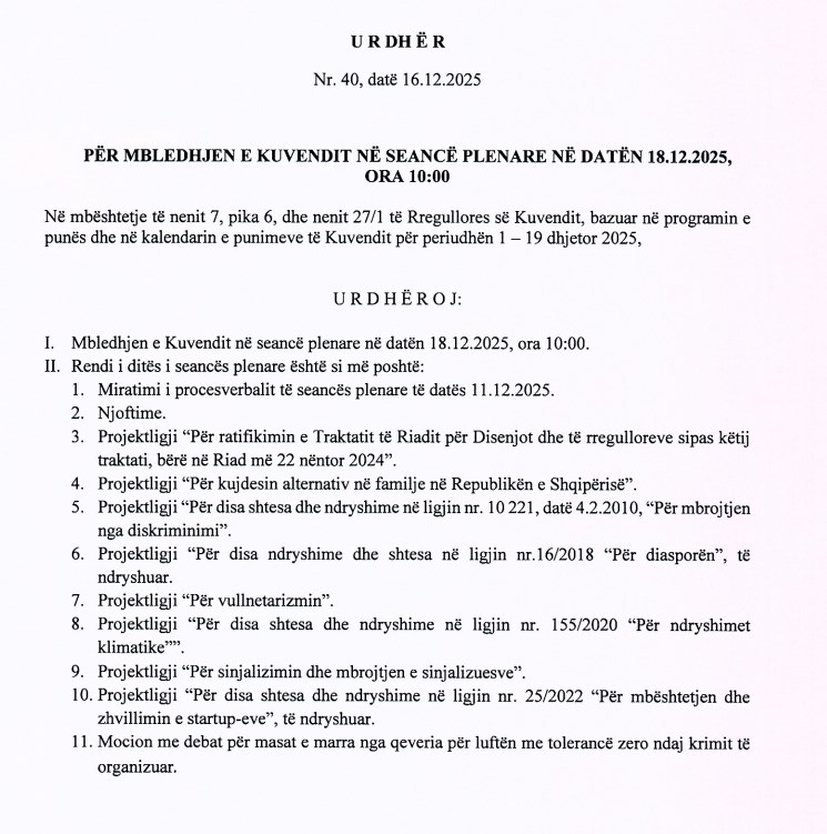 I. Mbledhjen e Kuvendit në seancë plenare në datën 18.12.2025, ora 10:00.