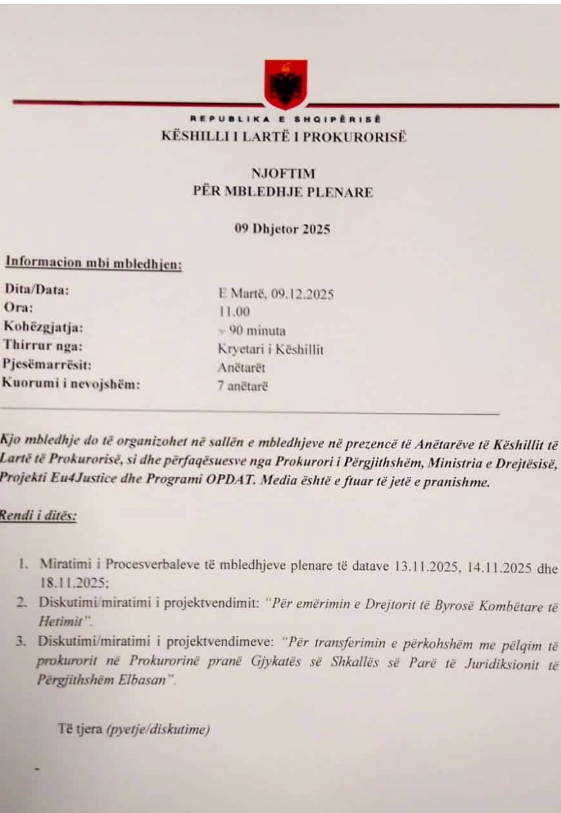 Kjo mbledhje do të organizohet në sallën e mbledhjeve në prezencë të Anëtarëve të Këshillit të Lartë të Prokurorisë, si dhe përfaqësuesve nga Prokurori i Përgjithshëm, Ministria e Drejtësisë, Projekti Eu4Justice dhe Programi OPDAT. Media është e ftuar të jetë e pranishme.