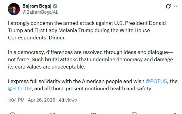 “Dënoj fuqishëm sulmin e armatosur ndaj Presidentit të SHBA dhe Zonjës së Parë gjatë darkës së korrespondentëve të Shtëpisë së Bardhë. Në një demokraci, dallimet zgjidhen përmes ideve dhe dialogut, jo përmes forcës”, u shpreh Begaj.