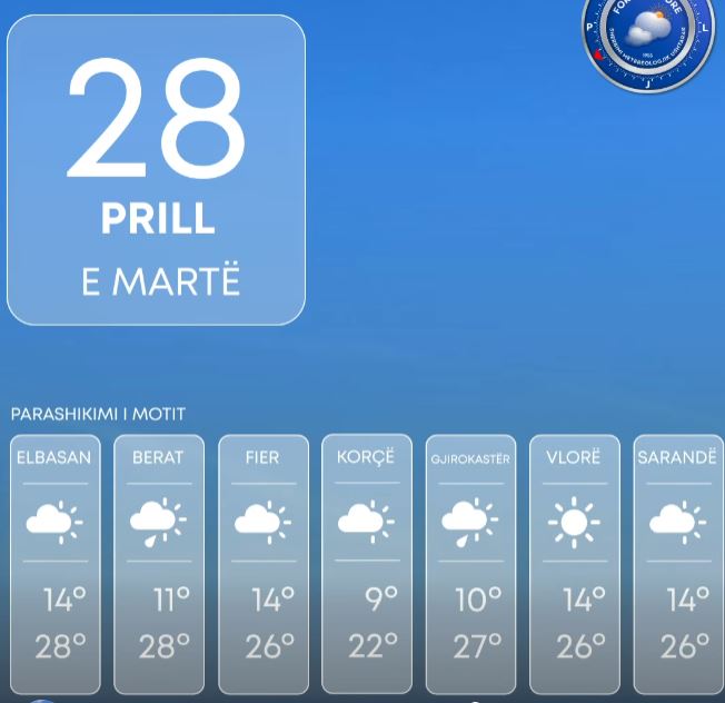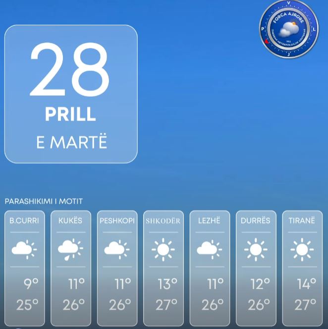 Ditën e sotme (28 prill), vendi ynë do të vijojë të ndikohet nga kushte atmosferike kryesisht të qëndrueshme. Temperaturat pritet të jenë të larta ku vlerat e mesditës do të ngjiten deri në 27 gradë në vendet e ulëta dhe bregdet dhe 24-25 gradë në vendet malore.