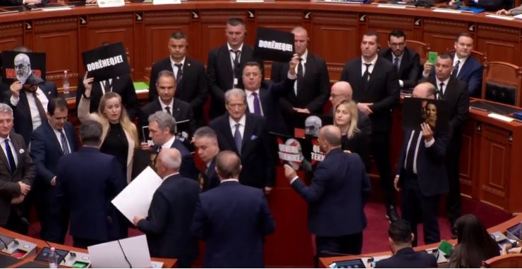 Një pjesë e deputetëve godisnin tavolinat, të tjerët, me në krye kreun e PD, Sali Berisha, dolën në podiumin e foltores duke protestuar dhe hedhur akuza ndaj qeverisë dhe socialistëve.