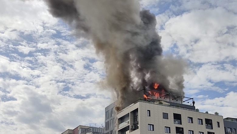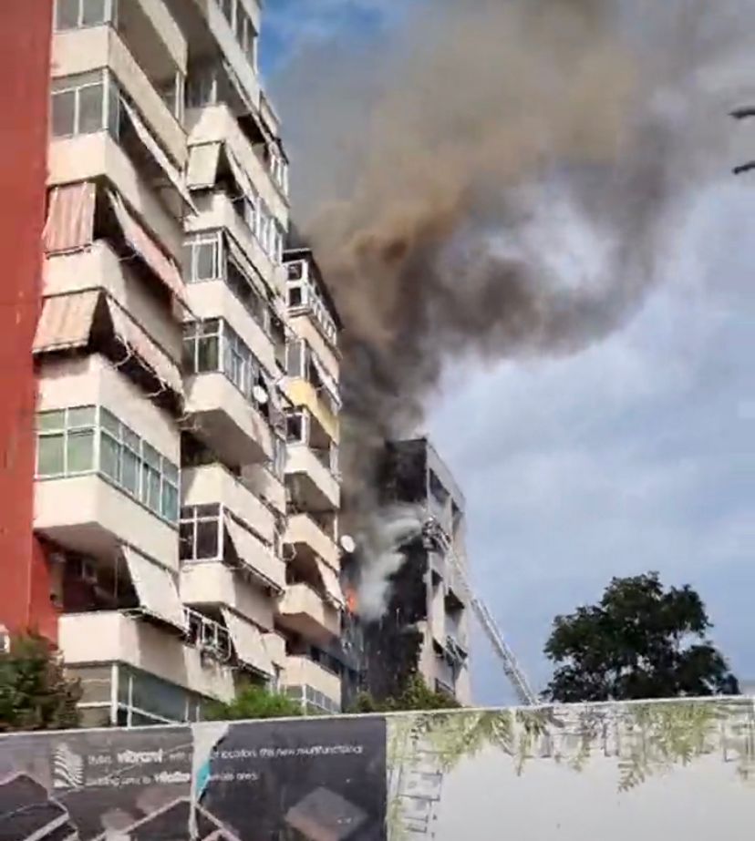 Në pamjet e publikuara në rrjetet sociale duken dy pallatet që digjen, teksa tym i zi del nga terraca e tyre.