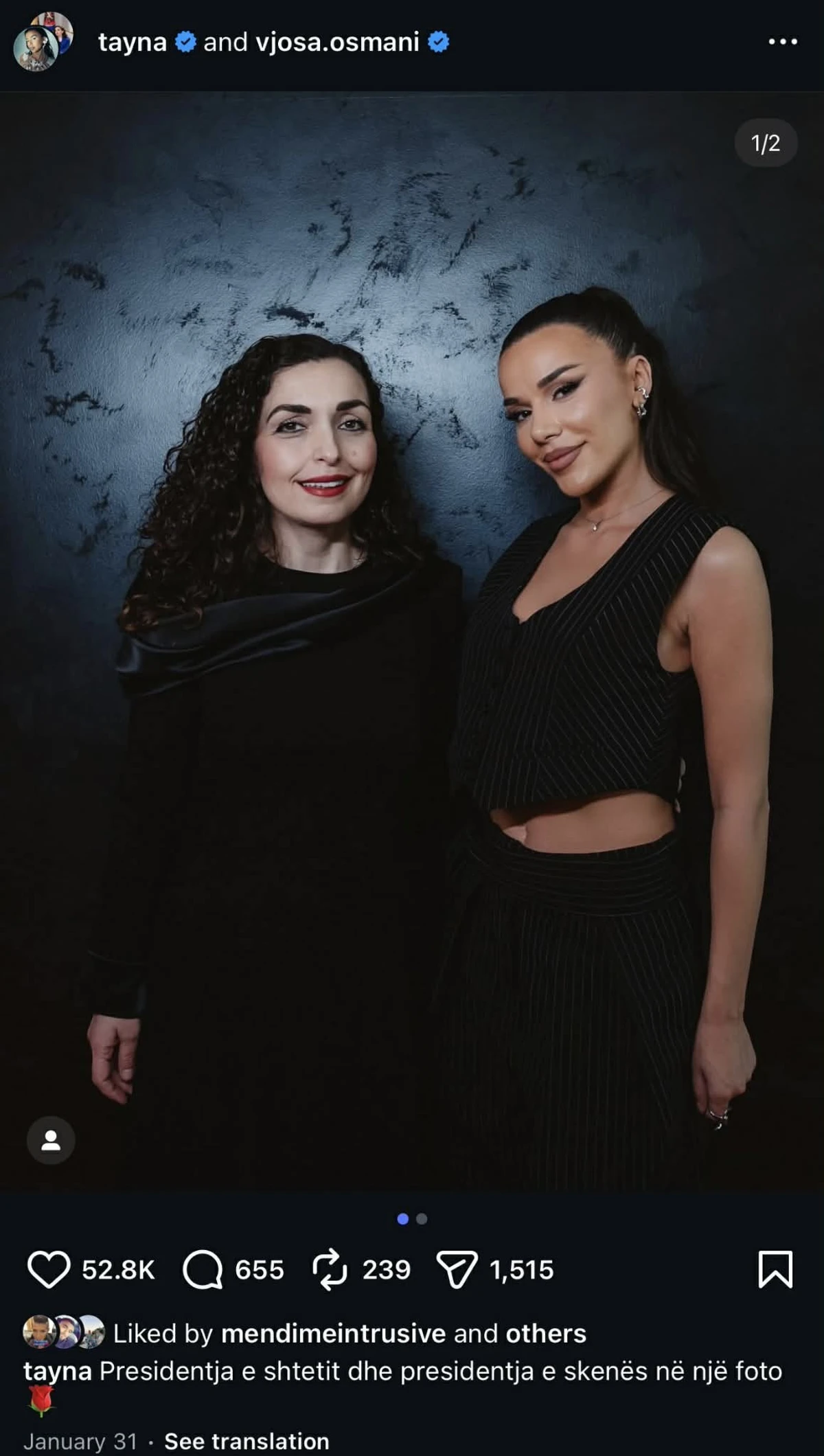 Ky veprim vjen pak kohë pas një fotografie të publikuar nga reperja Tayna, ku ajo shfaqej pranë Presidentes Osmani, me mbishkrimin: “Presidentja e shtetit dhe presidentja e skenës në një foto”.