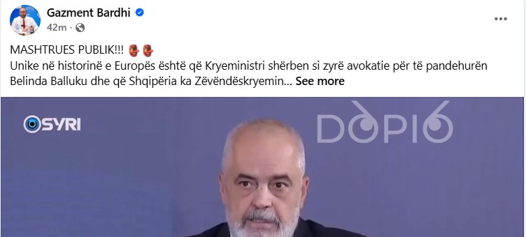 Në një postim në “Facebook”, kryetari i Grupit Parlamentar i Partisë Demokratike, Gazment Bardhi, ka komentuar qendrimin e kryeministrit Edi Rama, lidhur me çështjen e zv.kryeministres Belinda Balluku, ndaj të cilës GJKKO ka vendosur masat; pezullim nga detyra dhe bllokim të pasaportës.